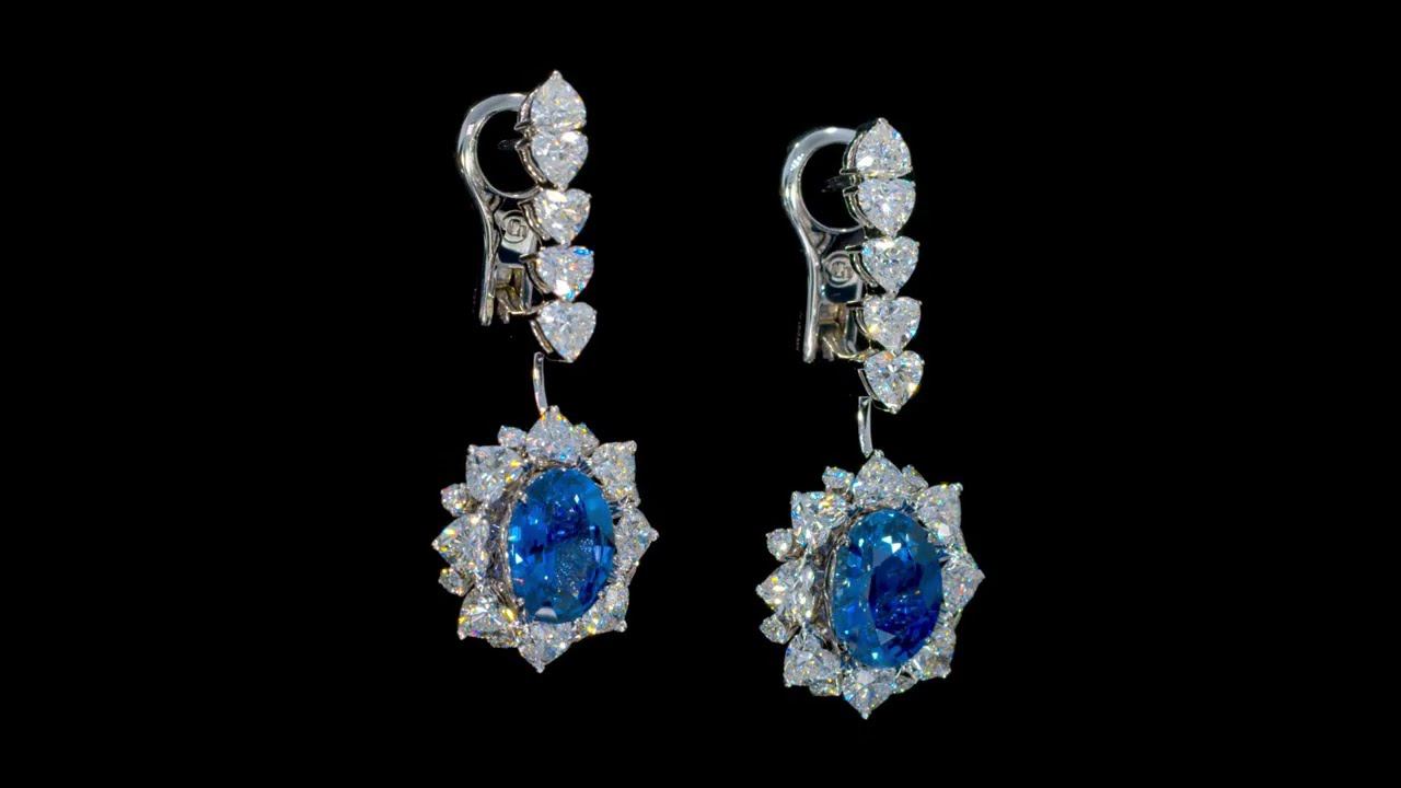 Цвет центральных сапфиров в серьгах «Диана» напоминает синеву волшебной ночи. Искры превосходных бриллиантов подобны яркому свету звезд — вечных спутников мифической богини. В серьгах "Диана" 2 природных сапфира 3,66 ct/ 3,13 ct эффектно дополнены 42 мерцающими бриллиантами общей каратностью 6,79 ct. The central sapphires in the "Diana" earrings are deep blue like a magical night. The superb diamonds shine like the bright light of the stars, eternal companions of the mythical goddess.
