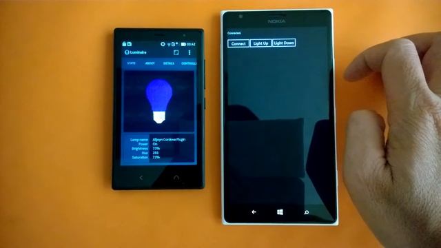 Using a Windows Phone Cordova app to control the virtual lamp running on an Android device.