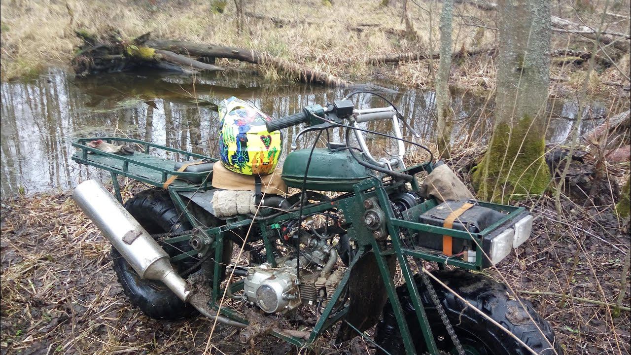 Полноприводный мотовездеход 2х2 и питбайк Irbis ttr125 пробираются через леса ручьи и болота.
