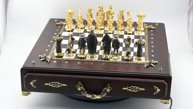 •Шахматный ларец изготовлен из дерева с элементами декора из бронзы и малахита. Ящики для фигур внутри обтянуты бархатом. Размер ларца 440*480*100мм. •Упаковано в деревянный кейс обтянутый искусственной кожей, размер 560*520*120мм. •Фигуры изготовлены из бронзы, доска из мрамора и габры-диобаза. •Размер игрового поля 280*280мм, размер клетки 35*35мм, размер пешки 21*21*58мм, размер короля 27*27*92мм. •Вес с упаковкой 17кг. •Рисунок и цвет камня уникален, поэтому может незначительно отличаться от экземпляра представленного на фотографии. Цена: 92 000 руб https://radugakamnya.ru/catalog/suveniry_iz_kamnya/suveniry_iz_zmeevika_i_krenoida/shakhmaty_i_nardy_iz_zmeevika/shakhmatnyy_larets_srednevekove_440_450_187mm-454815/