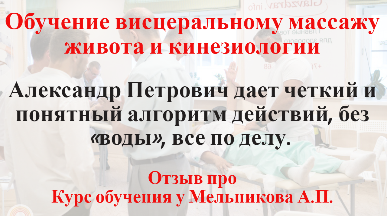 «На курсе по висцеральному массажу и кинезиологии Мельников А.П. дает рабочие инструменты, объясняет все доходчиво и если нужно повторяет несколько раз информацию. Александр Петрович дает четкий и понятный алгоритм действий, без «воды», все по делу. Курс висцерального массажа живота и прикладной кинезиологии мне очень понравился! Я решил некоторые проблемы в своем здоровье, уже нашел пациентов для применения данной методики. На этом курсе все предусмотрено и сделано все для студентов в плане организации. Я рекомендую данный курс всем, хотелось бы, чтобы, как можно больше человек узнали про эту методику!» ✅ Подробнее про обучение кинезиологии и висцеральному массажу живота и бронь места на курсе https://ruszdrava.ru ✅ Связаться с менеджером и задать вопросы про обучение на курсах: +79222160707