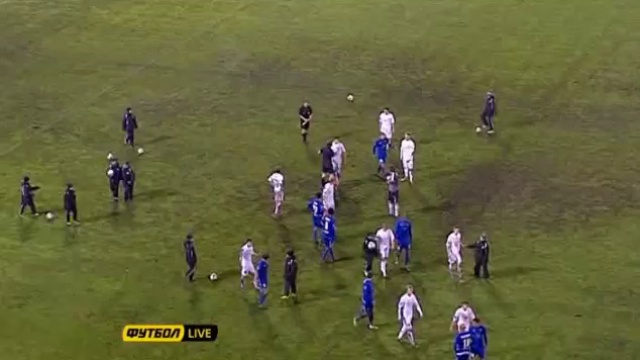 Голкипер симферопольской Таврии Сергей Погорелый после выездной победы в матче 1/8 финала Кубка Украины (2:3) проверяет на прочность челюсть полузащитника полтавской Ворсклы Артема Громова.