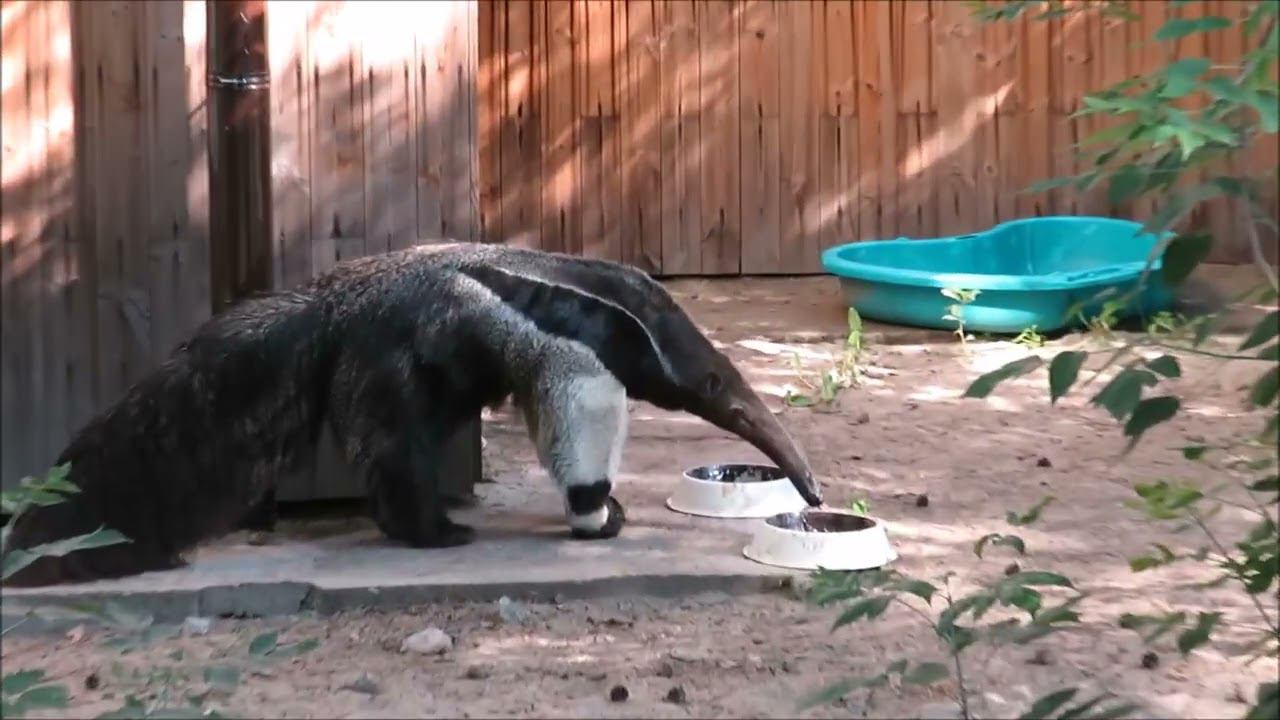 Пара гигантских муравьедов прибыла в Новосибирский зоопарк в 2020 году из зоопарка города Нюкеебинг-Морс (Дания). Наших гигантских муравьедов зовут Калле и Майя. Пара была сформирована несколько лет назад, у них уже рождались детеныши. 11 марта 2022 года родился детеныш краснокнижного гигантского муравьеда у нас в зоопарке. Их купают под душем в соседней комнате. Гигантский муравьед — самое крупное животное в отряде неполнозубых, длина его тела составляет 110-130 см. У него нет зубов, а язык достигает в длину 60 см — он нужен муравьеду для добычи корма. Животное разрушает термитники и муравейники, и языком, смоченным липкой слюной, быстро собирает насекомых. Кормят муравьеда однородной смесью фруктов, геркулеса, личинок насекомых, собачьего корма, торфа и других компонентов. Спит до 16 часов в сутки. Ходить по земле, имея такие длинные когти, трудно, и муравьеды вынуждены подгибать когти и опираться на тыльную сторону передних лап. Когтями легко защищается от врагов — одним ударом лапы большой муравьед способен выпотрошить собаку или даже убить человека и ягуара. В неволе живут до 14 лет. Самки муравьеда носят на спине единственного детёныша и не расстаются с ним от рождения до следующей беременности. Благодаря окраске, схожей с материнской, детёныш почти незаметен. Половозрелыми становятся через 2,5—4 года. Малыш уехал в Красноярск в другой зоопарк.