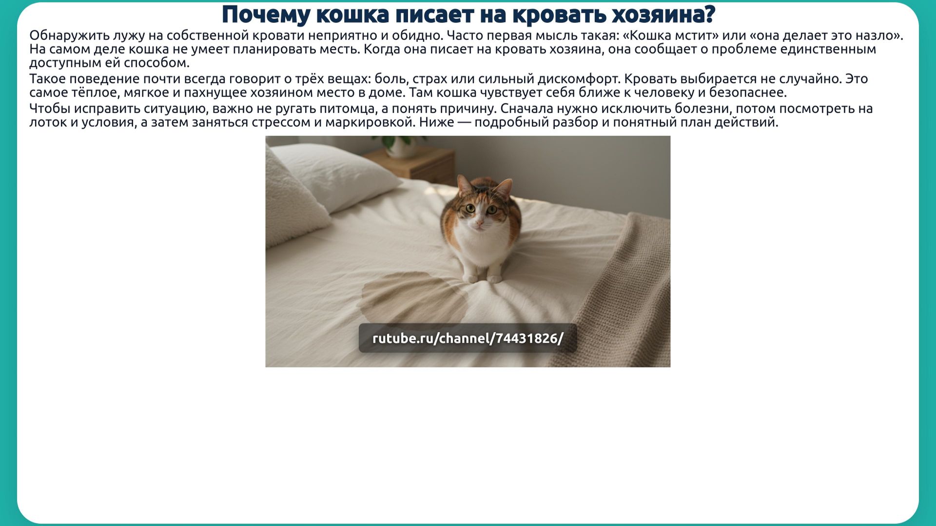 Почему кошка писает на кровать хозяина? Вы злитесь, обижаетесь и думаете о мести, а в это время ваш питомец кричит о помощи самым неприятным способом. Лужа на постели — не каприз и не «подлость», а знак того, что в жизни кошки что‑то серьёзно не так: боль, страх, стресс или даже обычный лоток, который она больше не может терпеть. В этом видео разберём, что на самом деле стоит за мочой на кровати: от скрытых болезней и цистита до ревности, переезда, нового питомца и ошибок с туалетом. Вы узнаете, почему кошка выбирает именно вашу постель, как отличить болезнь от стресса и что делать в первую очередь, а чего делать категорически нельзя. Если вы хотите понять своего питомца и перестать просыпаться в мокрой постели — смотрите до конца. Часто задаваемые вопросы: 1. Кошка писает на кровать, но в лоток тоже ходит. Это месть? Нет. Кошка не мстит. Лужи на кровати чаще всего говорят о боли, стрессе или неудобном лотке. Важно сначала проверить здоровье, а потом посмотреть на условия и атмосферу в доме. 2. С чего начать, если кошка внезапно начала писать на постель? Первый шаг — визит к ветеринару. Нужно исключить цистит, мочекаменную болезнь и другие проблемы мочевыводящих путей. Параллельно стоит оценить состояние лотка: чистота, размер, место, наполнитель. 3. Может ли причина быть только в лотке, без болезней и стресса? Да. Грязный, маленький, шумно расположенный лоток или неприятный наполнитель часто заставляют кошку искать другое место. Кровать кажется ей тёплой, мягкой и безопасной, поэтому она выбирает именно её. 4. Поможет ли кастрация, если кот метит кровать? Во многих случаях да. Кастрация снижает влияние половых гормонов и уменьшает потребность метить территорию. Но если привычка уже закрепилась или есть стресс, может понадобиться дополнительная работа с условиями и поведением. 5. Можно ли отучить кошку от луж на кровати наказаниями? Нет. Крики, тыканье носом и шлепки только усиливают страх и недоверие. Кошка будет прятаться и искать более скрытые места. Рабочий путь — понять причину, лечить болезни, сделать удобный лоток и снизить стресс.