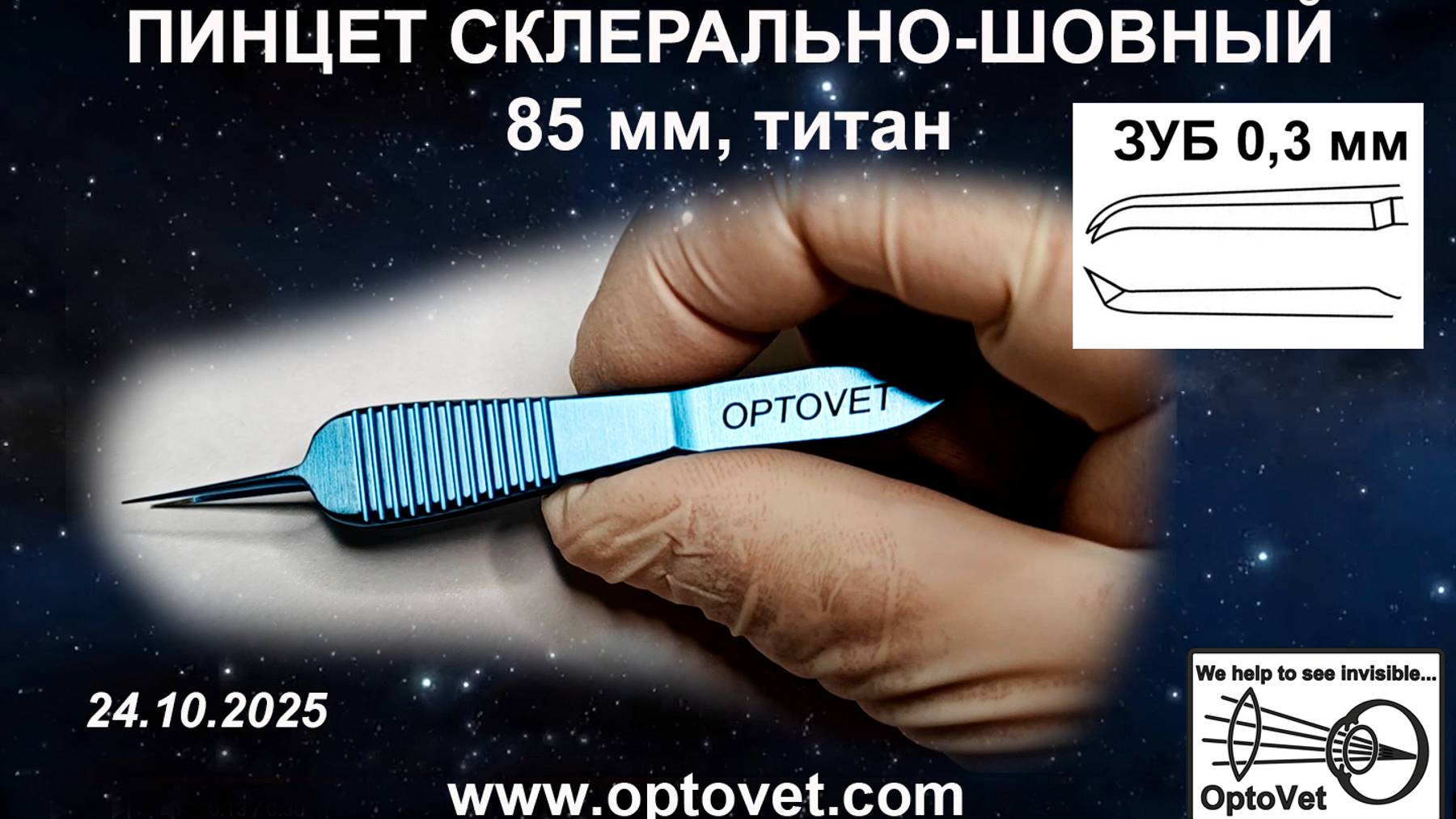 Микрохирургический 1х2 зубый пинцет для фиксации склеры и роговицы при наложении швов. Высота зуба 0,3 мм. Материал: хирургический титан.