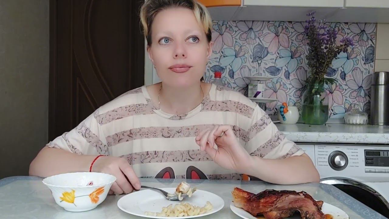 Мукбанг Куриный окорок и Треугольник из минтая а еще салат и макароны