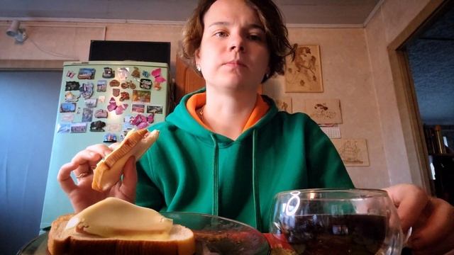 Mukbang - обычный завтрак: Бутерброды с колбасой и сыром и ароматный крепкий кофе.