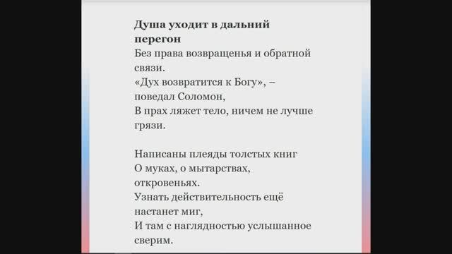 https://orthodoxbible.ru/poem.php?id=687 Душа уходит в дальний перегон Без права возвращенья и обратной связи. «Дух возвратится к Богу», – поведал Соломон, В прах ляжет тело, ничем не лучше грязи. Написаны плеяды толстых книг О муках, о мытарствах, откровеньях. Узнать действительность ещё настанет миг, И там с наглядностью услышанное сверим. Сомнения в невиденном ни разу: «Да есть ли вообще иное что-то?» Грех нераскаянный реальность ту размазал, – Кричим о том, а слышен только шёпот. Душещипательных видений в «Житиях» Не перечесть на трезвую погоду. Где без Писания, там умничать, вилять. Домысливать, твердить, не зная броду. Заботились народности издревле Посмертный как облегчить переход, Особенно в том преуспели греки – Легенды, эпосы творил себе народ. Но только Иегова нам открыл, И во Христе тот контур обозначил: «За нас Спаситель кровь Свою пролил», – Писанье возвещает, что не могло иначе. Не с журавлиной стаей полетим, Курлыча в сизой мгле совсем бесцельно; Посмертный путь обрежет смерти клин В воскресный день, отнюдь не в понедельник. Уверовав в Христа, Ему доверься, Облагородит душу Божий Дух. В загробный мир распахнутые двери, О, только бы светильник не потух. С Христом осмысленно, достойно и надёжно Хранитель-Ангел проведёт мытарства, Смерть и святым страшна была до дрожи – Бесстрашным быть пред смертью не похвастай. 26.05.2007. ИгЛа (Игнатий Лапкин) читает Дмитрий Вихров 18 июня 2025 г. среда вк - https://m.vk.com/fox8owlet