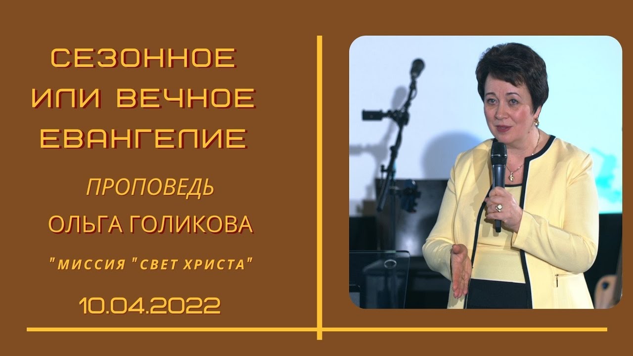 10.04.2022 - на воскресном служении в церкви «Миссия «Свет Христа», проповедь пастора Ольги Голиковой: «Сезонное или вечное Евангелие?». Ответьте для себя лично, какое Евангелие для вас сегодня существует? Как важно увидеть Библейские драгоценности и сложить их в единую картину всего Божьего Послания. *«32. Поступающих нечестиво против завета он привлечет к себе лестью; но люди, чтущие своего Бога, усилятся и будут действовать» (Даниил 11:32) Кто такие, поступающие нечестиво против завета? Тот, кто нарушает честь другого. Есть категория нечестия, которая будет увлечена лестью. «7. Итак, отдавайте всякому должное: кому по́дать — по́дать; кому оброк — оброк; кому страх — страх; кому честь — честь. 8. Не оставайтесь должными никому ничем, кроме взаимной любви; ибо любящий другого исполнил закон. 9. Ибо заповеди: «не прелюбодействуй», «не убивай», «не кради», «не лжесвидетельствуй», «не пожелай чужого» и все другие заключаются в сем слове: «люби ближнего твоего, как самого себя» (Послание к Римлянам 13:7-9). Любовь – есть исполнение закона, и это вечное Евангелие. «11. Так поступайте, зная время, что наступил уже час пробудиться нам от сна. Ибо ныне ближе к нам спасение, нежели когда мы уверовали» (Послание к Римлянам 13:11). В настоящее время испытываются ценности христианства. «12. Ночь прошла, а день приблизился: итак, отвергнем дела тьмы и облечемся в оружия света» (Послание к Римлянам 13:12). Свет – это оружие. Время беспечности закончилось. «14. но облекитесь в Господа нашего Иисуса Христа, и попечения о плоти не превращайте в похоти» (Послание к Римлянам 13:14) * Св. Евангелие от Матфея 24:6-14 * Откровение Иоанна Богослова 3:9,10 На какие параметры Господь испытывает человечество? – на человечность и на отношения с Богом. Отношение к Его ценностям. * Притчи 4:20-23 * Исаия 11:1-3 1. После сего я взглянул, и вот, дверь отверста на небе, и прежний голос, который я слышал как бы звук трубы, говоривший со мною, сказал: взойди сюда, и покажу тебе, чему надлежит быть после сего. 2. И тотчас я был в духе; и вот, престол стоял на небе, и на престоле был Сидящий; 3. и Сей Сидящий видом был подобен камню яспису и сардису; и радуга вокруг престола, видом подобная смарагду. 4. И вокруг престола двадцать четыре престола; а на престолах видел я сидевших двадцать четыре старца, которые облечены были в белые одежды и имели на головах своих золотые венцы. 5. И от престола исходили молнии и громы и гласы, и семь светильников огненных горели перед престолом, которые суть семь духов Божиих; 6. и перед престолом — море стеклянное, подобное кристаллу; и посреди престола и вокруг престола — четыре животных, исполненных очей спереди и сзади» (Откровение Иоанна Богослова 4:1-6) «6. И я взглянул, и вот, посреди престола и четырех животных и посреди старцев стоял Агнец как бы закланный, имеющий семь рогов и семь очей, которые суть семь духов Божиих, посланных во всю землю» (Откровение Иоанна Богослова 5:6) «1. И видел я в деснице у Сидящего на престоле книгу, написанную внутри и отвне, запечатанную семью печатями. 2. И видел я Ангела сильного, провозглашающего громким голосом: кто достоин раскрыть сию книгу и снять печати ее? 3. И никто не мог, ни на небе, ни на земле, ни под землею, раскрыть сию книгу, ни посмотреть в нее. 4. И я много плакал о том, что никого не нашлось достойного раскрыть и читать сию книгу, и даже посмотреть в нее. 5. И