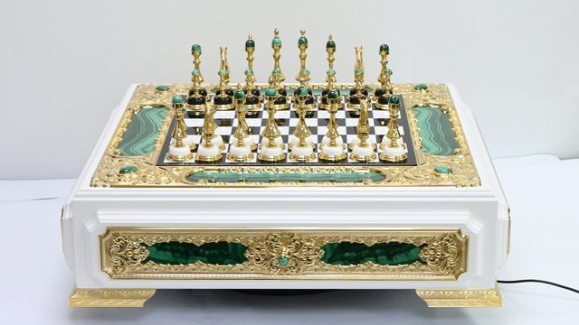•Шахматы изготовлены в ручную по традиционным технологиям Уральских мастеров. •Материал: малахит, магнезит, долерит, бронза, латунь, никель, золото, дерево. •Техника исполнения: токарные работы по металлу, фрезеровка металла, травление, ручная рисовка, гравирование иглой, гравирование резцом, ручная подрезка, никелирование, золочение, камнерезные работы, ювелирные работы. •Содержание драгоценных металлов: никель - 20мкм, золото (999,9)-5мкм. •Размер ларца: 590*540*150мм. •Размер игрового поля: 325*325 мм. •Размер фигур: Король 35*35*110 мм, Пешка 35*35*56 мм. •Вес шахмат без упаковки: 31,8кг •Вес в упаковке:40кг. •При заказе вы покупаете образец, который представлен на фото. Цена: 428 000 руб. https://radugakamnya.ru/catalog/suveniry_iz_kamnya_po_tipam/shakhmaty_i_nardy_iz_kamnya/eksklyuzivnye_nardy_s_yashmoy_ruchnoy_raboty-539541/