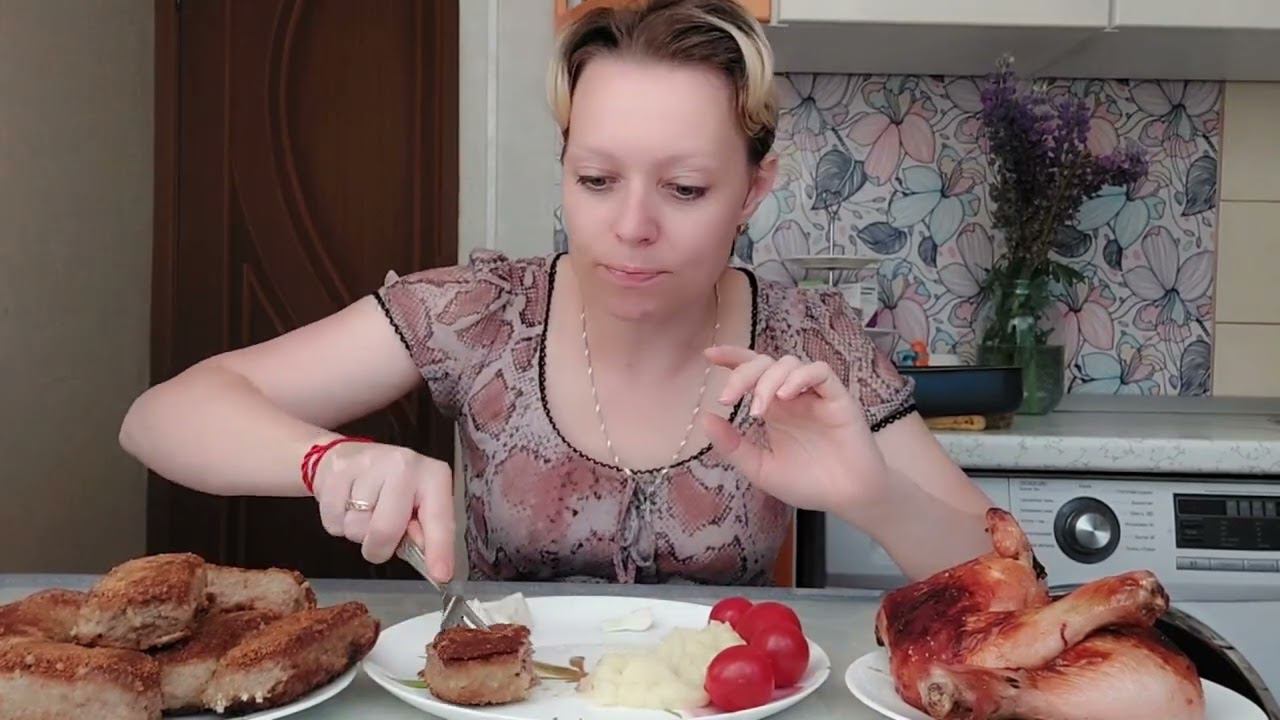 Мукбанг Окорока в соусе Котлеты и картофельное пюре