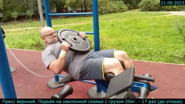 21.09.2023 - Пресс верхний. Подъём на наклонной скамье с грузом 20кг. - 17 раз (до отказа)