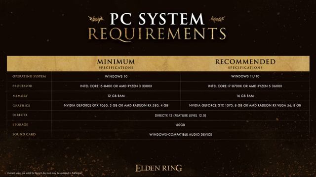 Опубликованы полные системные требования Elder Ring на ПК Релиз игры состоится 25 февраля 2022 года.Разработчики Elder Ring опубликовали «минимальные» и «рекомендуемые» системные требования проекта. Кстати, минимальные требования совпадают с представленными ранее в Steam.Для запуска проекта потребуется процессор уровня Intel Core i5-8400 или AMD Ryzen 3 3300X, 12 ГБ оперативной памяти, видеокарта NVIDIA GeForce GTX 1060 или AMD Radeon RX 580 или лучше, а также 60 ГБ свободного места на жестком диске и ОС Windows 10. Рекомендованные системные требования выглядят следующим образом: процессор Intel Core i7-8700K/AMD Ryzen 5 3600X, 16 ГБ ОЗУ, видеокарта уровня NVIDIA GeForce GTX 1070 или AMD Radeon RX Vega 56, 60 ГБ свободного места на диске, ОС Windows 11 и поддержка DirectX 12.Напомним, игра выходит 25 февраля 2022 года на ПК и консолях PlayStation и Xbox. ПК-версия Elder Ring получит античит «Easy Anti-Cheat», знакомый по играм Fortnite, Apex Legends и Rust.