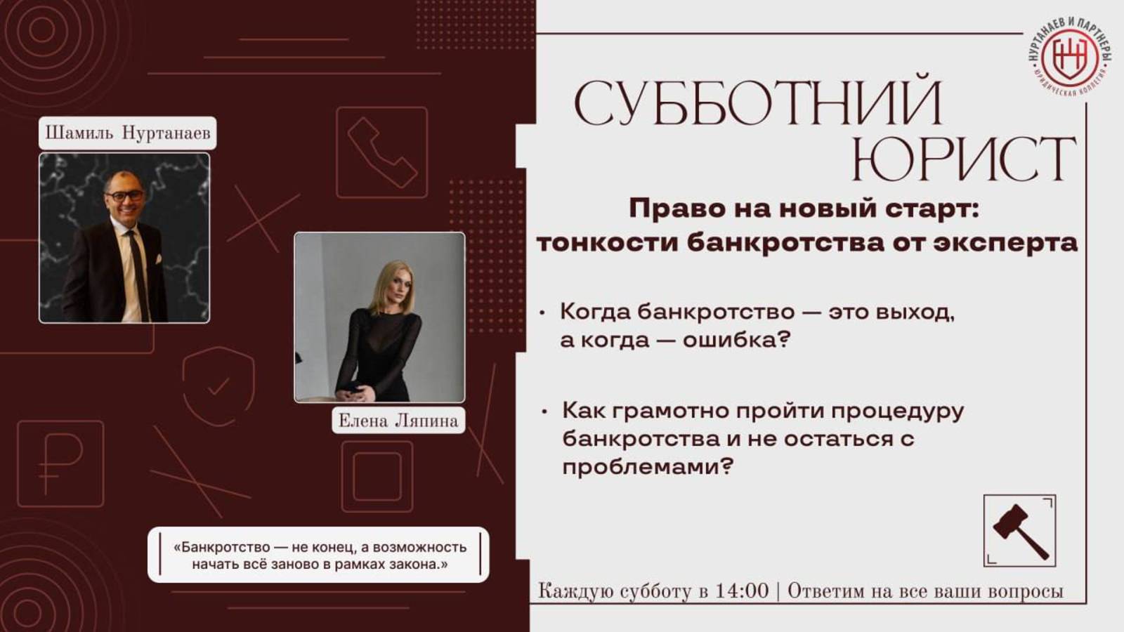 Друзья, каждую субботу в Telegram-канале "Субботний юрист" (https://t.me/SaturdayLawyer) мы проводим для вас увлекательнейшие трансляции, тема которой подбирается на основе ваших обращений в Юридическую коллегию "Нуртанаев и партнеры" Каждый из вас может задать вопрос нам на сайте или в соцсетях по ссылке: https://clck.ru/3ByDxh Также, вы можете просто связаться с нами по номеру +7(495)006-78-08, по вашему желанию ответы прозвучат прямом эфире Скорее подписывайтесь, чтобы не пропустить следующую трансляцию: https://t.me/SaturdayLawyer