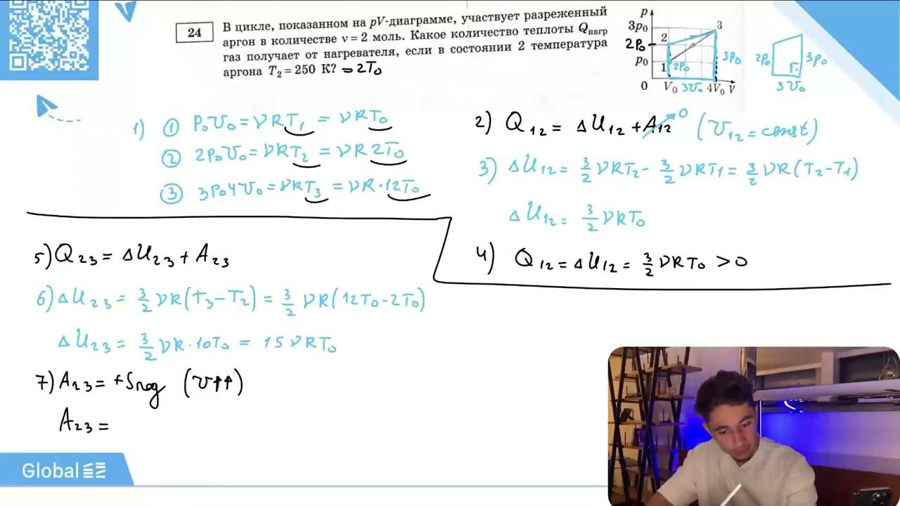 В цикле, показанном на pV- диаграмме, участвует разреженный аргон в количестве ν = 2 моль. Какое - №