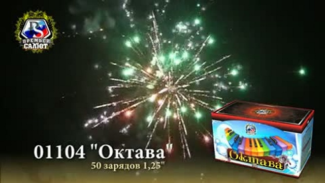 Артикул: 01104 Кол-во зарядов: 50 шт. Калибр: 1.2 " Время работы: 25 с. Высота подъёма: 30 м. Эффект: Золотой мерцающий занавес, зеленые и красные звезды раскрываются мерцающими ивами с красными и зелеными георгинами. Двухуровневый эффект: на нижнем уровне - золотой занавес, на верхнем - бурак синих жемчужин. В финале панорамный эффект: синие звезды раскрываются золотыми мерцающими коронами с пестиком синих жемчужин.