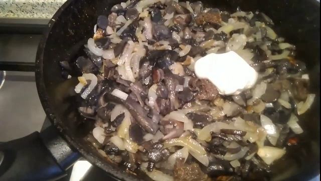 Грибы жареные с луком и сметаной. Ссылка на видео в YouTube: https://www.youtube.com/watch?v=Ri2ZYnIn7G4&t=194s