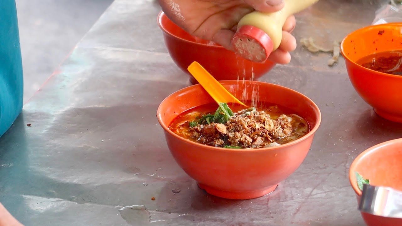 Острый суп с лапшой и рыбными шариками — малазийская уличная еда