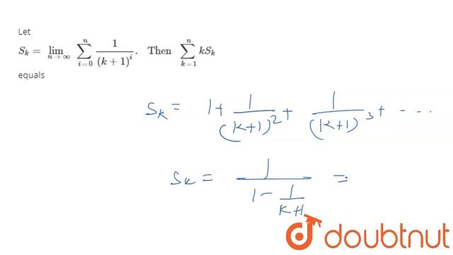 Let `S_(k)=lim_(n to oo) sum_(i=0)^(n) (1)/((k+1)^(i))." Then " sum_(k=1)^(n) kS_(k)` equals