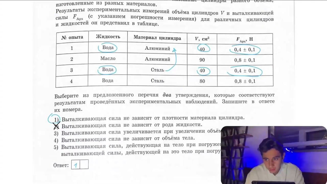 Ученик провёл эксперимент по изучению выталкивающей силы, действующей на тело, полностью - №27834