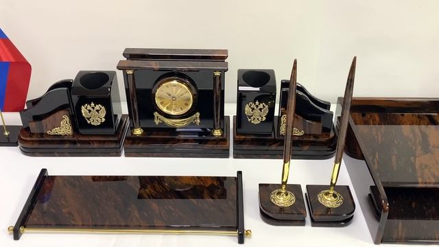 •Материал: обсидиан, кварцовый механизм, художественное литьё из бронзы. •Техника исполнения: камнерезные работы. •При заказе вы получаете образец, который представлен на фотографии. •Общие габариты настольного набора 770*450*190мм - Часы 190*80*155мм-1шт. - Основание под часы 200*110*30мм-1шт. - Подставка под планинг 370*140*27мм-1шт. - Бумажница 115*75*100мм-2шт. - Карандашница 76*76*120мм-2шт. - Основание под бумажницу и карандашницу 200*110*30мм-2шт. - Подставка с тюльпаном 70*70*115мм-2шт. - Подставка под флагшток 64*64*10-1шт. - Лоток 315*235*80мм. •Упаковка: деревянный чемодан обтянутый искусственной кожей. Размер чемодана 440*360*400мм. •Масса нетто: 15кг. •Масса брутто: 24,2кг. https://radugakamnya.ru/catalog/suveniry_iz_kamnya/suveniry_iz_obsidiana/pismennye_nabory_iz_obsidiana/nastolnyy_nabor_iz_obsidiana_s_lotkom_a4_770_450_190mm-229149/