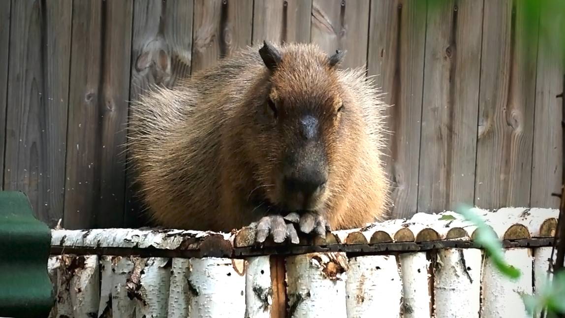Капибара прогулялась, поела зеленых листиков и спряталась от солнца в тень.