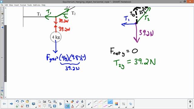 Finding tensions in slanted rope and horizontal rope for object hanging in equilibrium. (Please excuse the low volume - the microphone had a lose wire and needed to be replaced). Written solution found here: https://drive.google.com/file/d/0B0_WVxpjfUcuQU50WVZhZnlwYTg/view?usp=sharing&resourcekey=0-ydpN-Eo7Y816K6erhw-dxQ