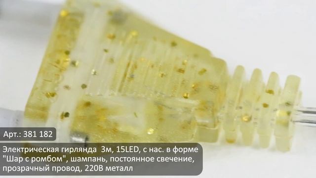 Электрическая гирлянда 3м, 15LED, с нас. в форме "Шар с ромбом", шампань, постоянное свечение, прозрачный провод, 220В металл Электрогирлянды с металлическими насадками в форме резного шара. Артикул 381-182