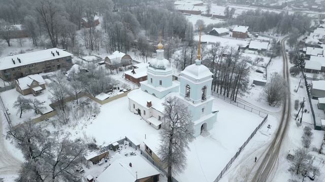 Домик без крыши в Ольгово, ёлки в снегу и Церковь Введения во храм Пресвятой Богородицы