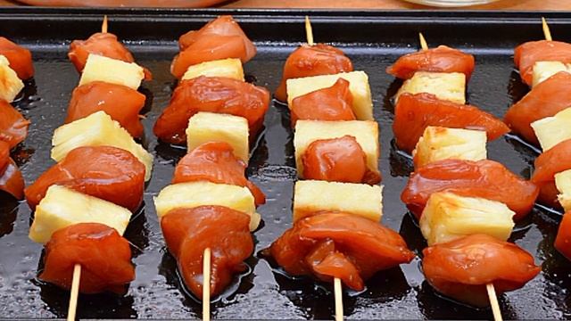 Куриный шашлык с ананасом - волшебно вкусный и нежный, а также немного экзотический шашлычок из курицы, который несложно приготовить в домашних условиях. Получается не хуже, чем на открытых углях. Ингредиенты: Куриная грудка2 штуки, Ананас1 штука, Кетчуп100 мл, Соевый соус100 мл, Апельсин1 штука, Корень имбиря 5 см1 штука, Коричневый сахар1 ст. ложка, Благодарим за просмотр! Подписывайтесь на канал🍕 Поделитесь своим мнениенм о рецепте в комментариях!