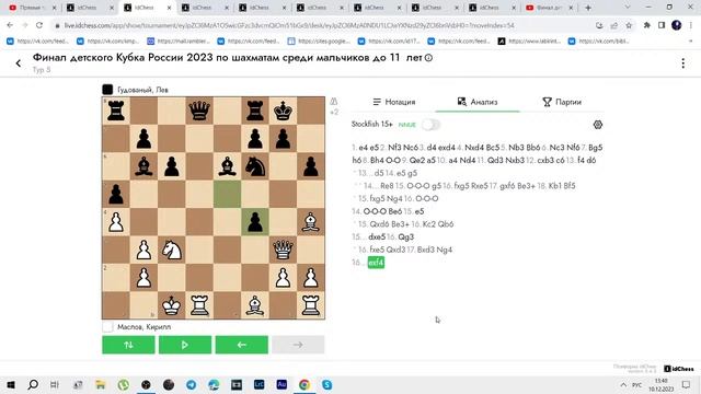 Финал детского Кубка России Трансляция детского турнира, который проходит в г. Ярославль Обзор партий до 9,11,13 и 15 лет среди мальчиков и девочек #кубокроссии #финалдетскогокубка #шахматыроссия --------- ________________________ ?ДЗЕН https://zen.yandex.ru/id/60da01dc2adb0d342d31af8d ?Телеграмм https://t.me/simplechess ✅https://boosty.to/chesswave ?Группа Вконтакте! https://vk.com/chesswave ?Сообщество на Lichess https://lichess.org/team/kKzN0yDO ? Рутьюб: https://rutube.ru/channel/24111478/ ?Купить рекламу: https://telega.in/c/simpleches ?Поддержать! https://www.donationalerts.com/r/chesswave ✌QIWI http://qiwi.com/n/GOTTI118 ? ЮMoney 41001456772177 Ссылка на трансляцию https://live.idchess.com/app/show/tournament/eyJpZCI6MzA1NywicGFzc3dvcmQiOm51bGx9?tour=eyJpZCI6MTcyMDYsInBhc3N3b3JkIjpudWxsfQ==