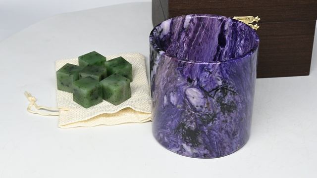 •Материал: чароит. •Объём: 330мл. •Вес: 453г. •В комплекте идут 6 кубиков для охлаждения из качественного нефрита. •Упаковка: индивидуальная шпоновая коробка. •Допустимо присутствие природных микротрещин, не пропускающих жидкость. •При заказе вы покупаете образец, который представлен на видео.