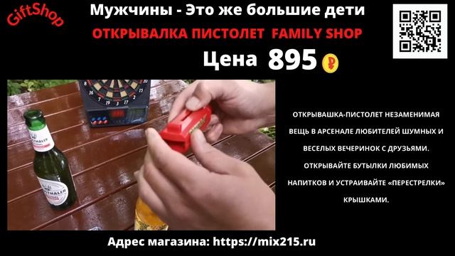 ОПИСАНИЕ ОТКРЫВАШКА-ПИСТОЛЕТ НЕЗАМЕНИМАЯ ВЕЩЬ В АРСЕНАЛЕ ЛЮБИТЕЛЕЙ ШУМНЫХ И ВЕСЕЛЫХ ВЕЧЕРИНОК С ДРУЗЬЯМИ. ОТКРЫВАЙТЕ БУТЫЛКИ ЛЮБИМЫХ НАПИТКОВ И УСТРАИВАЙТЕ «ПЕРЕСТРЕЛКИ» КРЫШКАМИ. ТАКИХ ОТКРЫВАШЕК ВЫ ТОЧНО НЕ ВИДЕЛИ! ЗАБАВНОЕ ИЗДЕЛИЕ В ВИДЕ ПИСТОЛЕТА СНИМАЕТ КРЫШКУ С БУТЫЛКИ, А ЗАТЕМ ВЫ МОЖЕТЕ ВЫСТРЕЛИТЬ СНАРЯДОМ-КРЫШКОЙ, НАЖАВ НА СПУСКОВОЙ КРЮЧОК НА ОТКРЫВАШКЕ. КРЫШКА УДЕРЖИВАЕТСЯ В ОТКРЫВАШКЕ ЗА СЧЕТ МЕТАЛЛИЧЕСКОГО ГНЕЗДА ВНУТРИ ПРЕДМЕТА И НЕОДИМОВОГО МАГНИТА. ДИАМЕТР ОТКРЫВАШКИ ПОДХОДИТ ПО РАЗМЕРУ К БОЛЬШИНСТВУ ВЫПУСКАЕМЫХ БУТЫЛОК. ИЗГОТОВЛЕНА ИЗ ПРОЧНОГО ПЛАСТИКА ВЫСОКОГО КАЧЕСТВА. АКСЕССУАР НЕ ТРЕБУЕТ ОСОБОГО УХОДА, НЕ ЗАНИМАЕТ МНОГО МЕСТА НА КУХНЕ И ТОЧНО ПРИВЛЕЧЕТ К СЕБЕ ВНИМАНИЕ НА ВЕЧЕРИНКЕ. КОМПЛЕКТАЦИЯ ОТКРЫВАШКА-ПИСТОЛЕТ - 1 ШТ. ХАРАКТЕРИСТИКИ ОБЩИЕ БРЕНД FAMILY SHOP СТРАНА-ИЗГОТОВИТЕЛЬ КИТАЙ ДОПОЛНИТЕЛЬНЫЕ ТИП ОТКРЫВАЛКА МАТЕРИАЛ ЛЕЗВИЯ МЕТАЛЛ МАТЕРИАЛ РУКОЯТИ ПЛАСТИК АРТИКУЛ 366 ИНФОРМАЦИЯ О ТЕХНИЧЕСКИХ ХАРАКТЕРИСТИКАХ, КОМПЛЕКТЕ ПОСТАВКИ, СТРАНЕ ИЗГОТОВЛЕНИЯ, ВНЕШНЕМ ВИДЕ И ЦВЕТЕ ТОВАРА НОСИТ СПРАВОЧНЫЙ ХАРАКТЕР И ОСНОВЫВАЕТСЯ НА ПОСЛЕДНИХ ДОСТУПНЫХ К МОМЕНТУ ПУБЛИКАЦИИ СВЕДЕНИЯХ Адрес магазина: https://mix215.ru