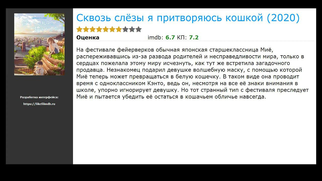 Список фильмов, которые по мнению зрителей похожи на Девушка из долины (2020): 00:00 Вступление 00:10 Мьюзик (2021) / жанр: мюзикл, драма / в главных ролях: Кейт Хадсон, Лесли Одом мл., Мэдди Зиглер 00:23 Охана: В поисках сокровища (2021) / жанр: мюзикл, драма / в главных ролях: Алекс Айоно, Ки Пиху, Линдсей Уотсон 00:36 Школа отменяется навсегда (2021) / жанр: мюзикл, драма / в главных ролях: Оскар Кеннеди, Энтони Хэд, Саманта Бонд 00:55 Карта совершенных мгновений (2021) / жанр: мюзикл, драма / в главных ролях: Кайл Аллен, Кэтрин Ньютон, Jermaine Harris 01:11 Американский пирог представляет: Правила для девочек (2020) / жанр: мюзикл, драма / в главных ролях: Мэдисон Петтис, Лиззи Бродвей, Natasha Behnam 01:24 Половина всего (2020) / жанр: мюзикл, драма / в главных ролях: Дэниэл Димер, Леа Лианг, Бекки Энн Бэйкер 01:40 Картинг (2020) / жанр: семейный, спорт / в главных ролях: Уильям Лоддер, Фрэнсис О’Коннор, Анастасия Бампос 01:59 Звонок из подземелья (2020) / жанр: семейный, спорт / в главных ролях: Лин Шэй, Тобин Белл, Честер Рашинг 02:15 Сквозь слёзы я притворяюсь кошкой (2020) / жанр: семейный, спорт / в главных ролях: Мираи Сида, Нацуки Ханаэ, Минако Котобуки 02:28 Никогда, редко, иногда, всегда (2020) / жанр: семейный, спорт / в главных ролях: Сидни Фланиган, Талия Райдер, Теодор Пеллерен 02:41 Наездница (2020) / жанр: семейный, спорт / в главных ролях: Элисон Бри, Молли Шеннон, Goldenite 02:54 Вампиры в Бронксе (2020) / жанр: ужасы, комедия / в главных ролях: Джейден Майкл, Gerald W. Jones III, Gregory Diaz IV 03:11 Тайлер Рейк: Операция по спасению (2020) / жанр: боевик, триллер / в главных ролях: Крис Хемсворт, Rudraksh Jaiswal, Рандип Худа 03:24 Любовь и монстры (2020) / жанр: комедия, фантастика, боевик / в главных ролях: Дилан О’Брайен, Хиро, Джессика Хенвик 03:37 Химические сердца (2020) / жанр: комедия, фантастика, боевик / в главных ролях: Лили Рейнхарт, Остин Абрамс, Сара Джонс 03:56 Никто сегодня не спит в лесу (2020) / жанр: комедия, фантастика, боевик / в главных ролях: Julia Wieniawa-Narkiewicz, Михал Лупа, Виктория Гасиевска 04:09 Все там (2020) / жанр: комедия, фантастика, боевик / в главных ролях: Но Джон-и, Кым Сэ-рок, Ким Джун-вон 04:28 Жизнь за год (2020) / жанр: драма, мелодрама / в главных ролях: Кара Делевинь, Крис Д’Елия, Кьюба Гудинг мл. 04:41 Няня. Королева проклятых (2020) / жанр: драма, мелодрама / в главных ролях: Джуда Льюис, Дженна Ортега, Эмили Элин Линд 04:54 После. Глава 2 (2020) / жанр: драма, мелодрама / в главных ролях: Джозефина Лэнгфорд, Хиро Файнс-Тиффин, Дилан Спроус ► Больше похожих фильмов на Девушка из долины: https://likefilmdb.ru/film/devushka-iz-doliny-2020/similar/