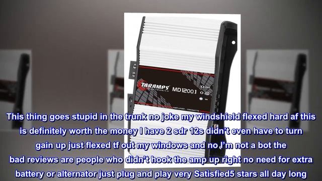 Taramps MD 1200.1 1 Channel 1200 Watts Rms Car Audio Amplifier 1 Ohm Amazon Product Link: http://amazon.com/dp/B074KQP62F/?tag=nd45-20 Full-range Class-D amplifier Crossover HPF and LPF Frequency Response: 10Hz ~ 20KHz 1 channel of 1200 watts RMS @ 1 Ohms Top reviews from the United States This thing is no joke. This thing goes stupid in the trunk no joke my windshield flexed hard af this is definitely worth the money I have 2 sdr 12s didn’t even have to turn gain up just flexed tf out my windows and no I’m not a bot the bad reviews are people who didn’t hook the amp up right no need for extra battery or alternator just plug and play very Satisfied5 stars all day long