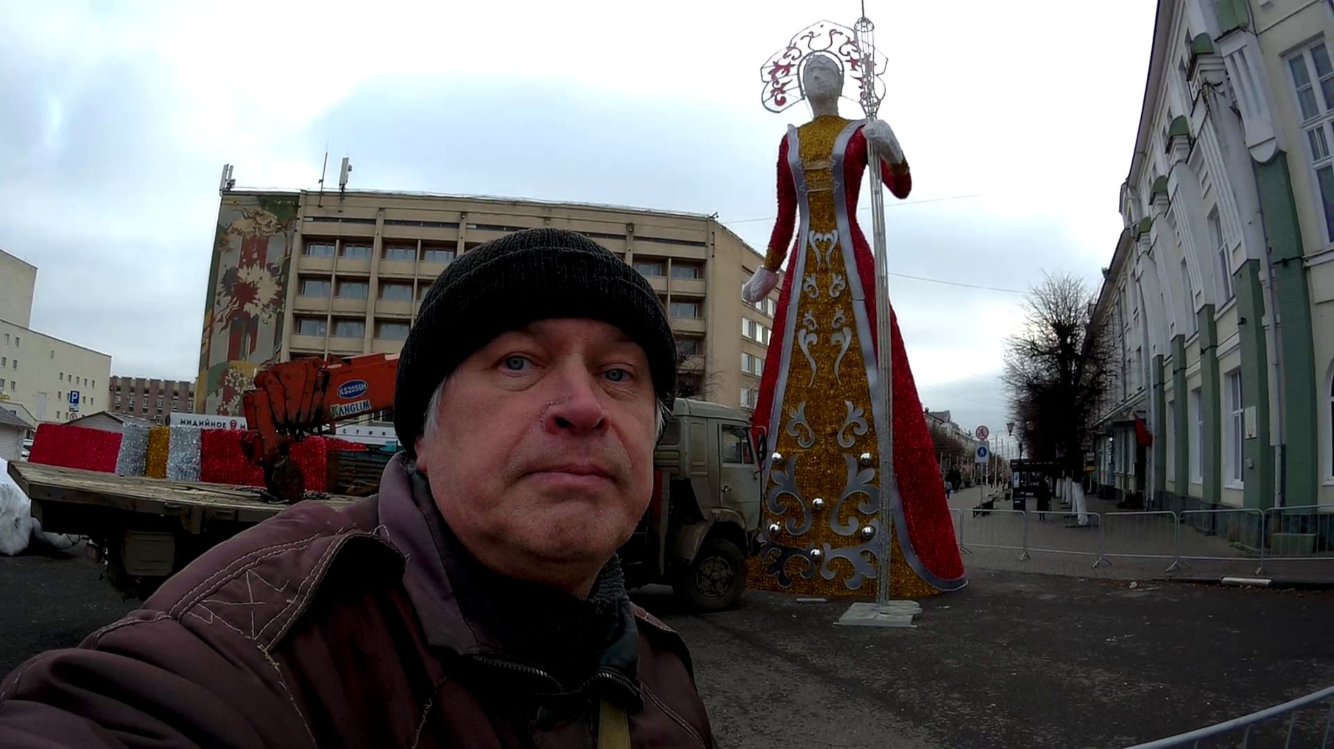 Геннадий Горин на площади, новогодняя ёлка и большая фигура снегурочка. Площадь Ленина, город Орёл
