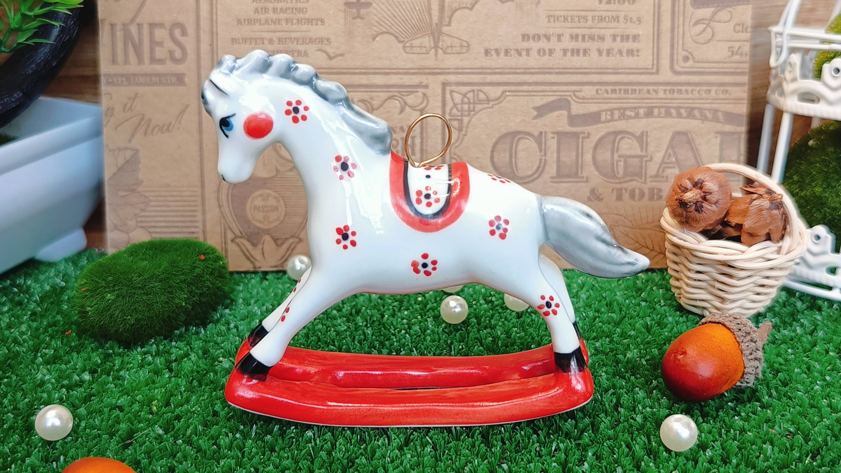 Ёлочная игрушка "Лошадка – качалка красная", гжельский фарфор