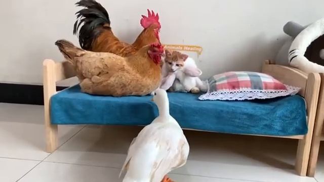 Курица и петух становятся опекунами котят - 2025 год