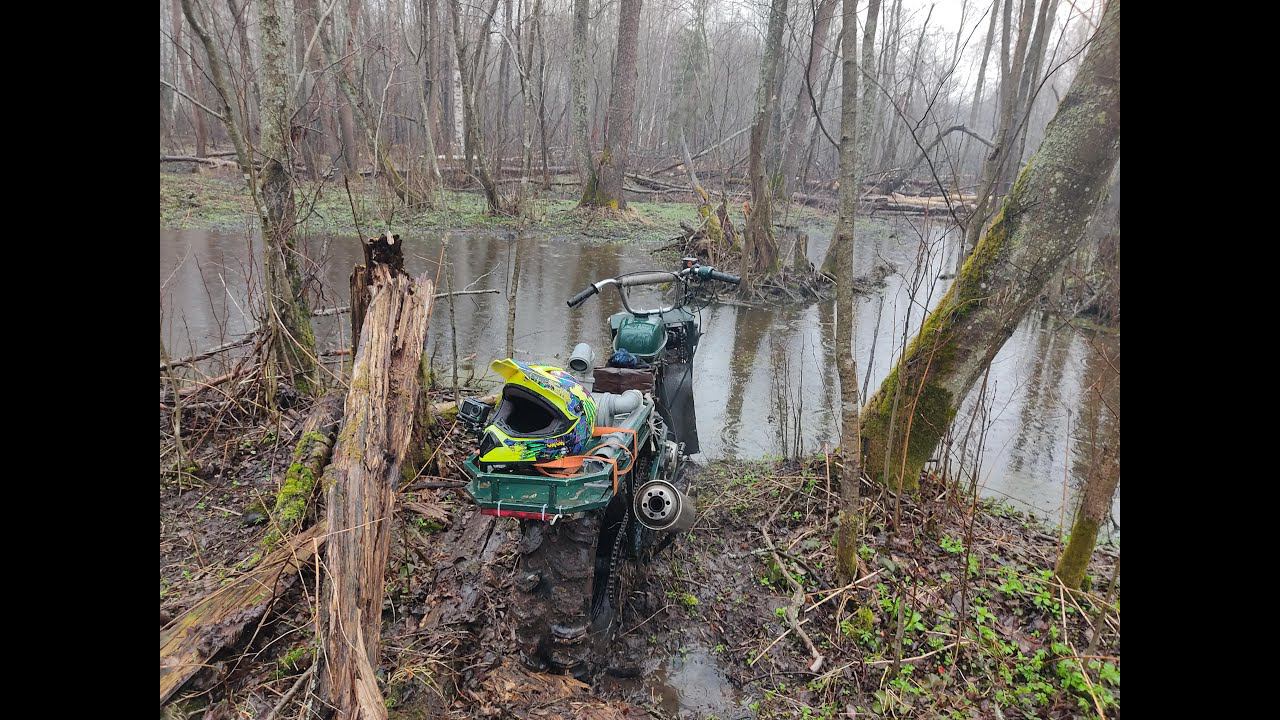 Через глубокий ручей на мотоцикле, воды по сидение, кругом затопленные леса