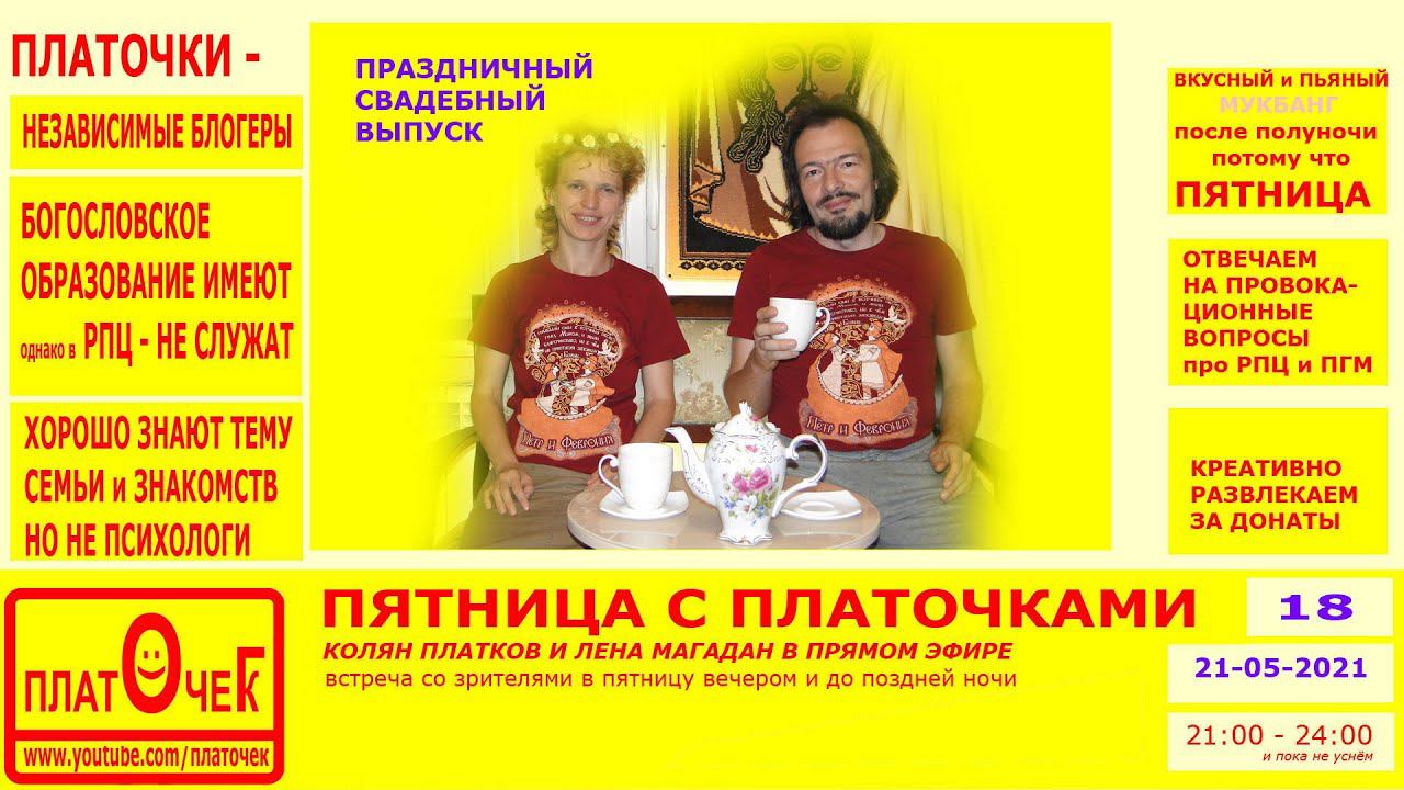 Говорим обо всём, расслабляемся, выполняем прикольные задания от зрителей за донат, отвечаем на провокационные вопросы про РПЦ и ПГМ (частное мнение светских людей с Богословским образованием) по теме "церковь и общество", "религия" и "религиозные заморочки". Весело проводим пятничный вечер. Донат: https://donationalerts.com/r/platochekg (исправлено!) Наш ВК: https://vk.com/kolyanplatkov Дзен: https://zen.yandex.ru/platochek Инста: https://instagram.com/magadanlena