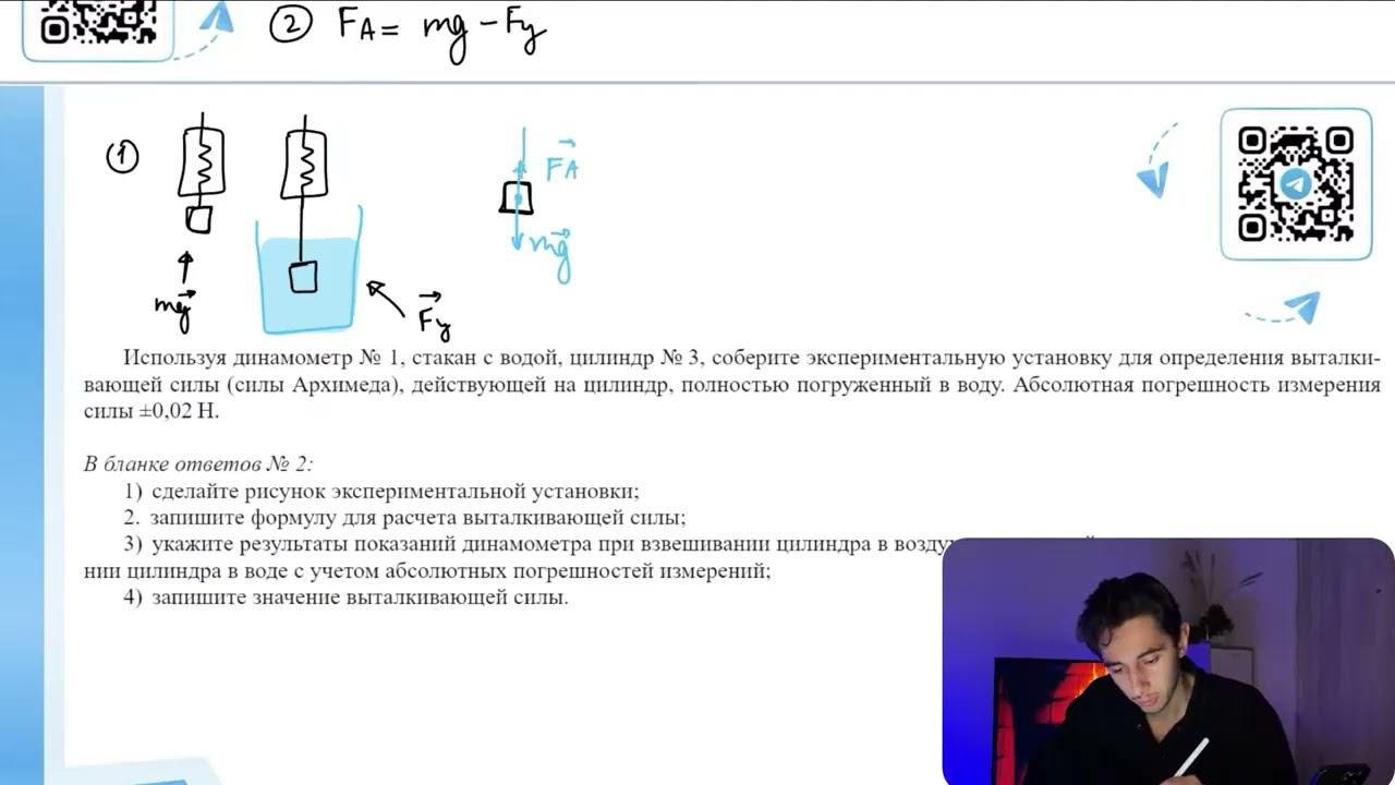 Используя динамометр №1, стакан с водой, цилиндр №3, соберите экспериментальную установку для - №