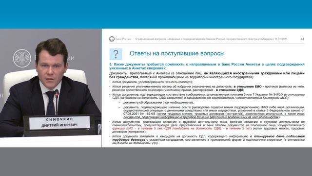 Вебинар о разъяснении вопросов, связанных с порядком ведения Банком России Государственного реестра ломбардов с 11.01.2021 Спикеры — представители Департамента допуска и прекращения деятельности финансовых организаций Банка России: Алексей Стаховский, Екатерина Савицкая, Дмитрий Симочкин. Презентация: http://www.cbr.ru/StaticHtml/File/118710/Webinar_16.02.2021.pdf Образцы заполняемых документов: http://www.cbr.ru/StaticHtml/File/118710/00_Primer_zayavlenie_lombarda_12.02.2021.pdf http://www.cbr.ru/StaticHtml/File/118710/01_Primer_anketa_1.pdf http://www.cbr.ru/StaticHtml/File/118710/02_Primer_anketa_2.pdf http://www.cbr.ru/StaticHtml/File/118710/03_Primer_svedeniya_3.pdf