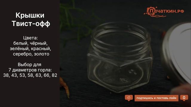 Закручивающиеся или винтовые крышки Твист-офф (Twist off). У нас можно купить различных размеров 38, 43, 53, 58, 63, 66, 82 мм в различных цветах. Продажа от 10 штук. Подробное описание и цены на нашем сайте: http://www.pechatkin.org/banki/twistoff.html Доставка по всей России.