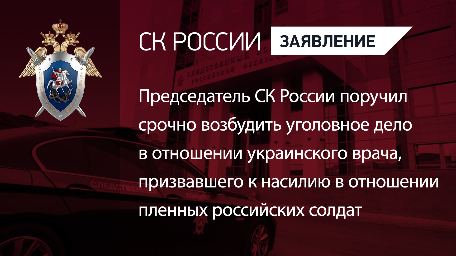 Руководитель украинского проекта «Мобильный госпиталь» Геннадий Друзенко в прямом эфире украинского телеканала призвал к насилию в отношении пленных солдат Вооруженных сил России. Такое указание он дал врачам мобильных госпиталей. Председатель Следственного комитета Российской Федерации Александр Иванович Бастрыкин поручил незамедлительно возбудить уголовное дело и дать процессуальную оценку действиям Друзенко. Для установления местонахождения врача, занявшего позицию, противоречащую закону и идущую вразрез с нормами медицинской этики, будет решен вопрос об объявлении его в международный розыск с целью привлечения к уголовной ответственности.