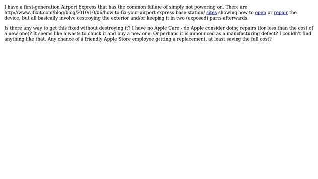 Apple: AirPort Express no power-on - can it be repaired or replaced? Helpful? Please support me on Patreon: https://www.patreon.com/roelvandepaar With thanks & praise to God, and with thanks to the many people who have made this project possible! | Content (except music & images) licensed under CC BY-SA https://meta.stackexchange.com/help/licensing | Music: https://www.bensound.com/licensing | Images: https://stocksnap.io/license & others | With thanks to user Sam Brightman (apple.stackexchange.com/users/533), user g . (apple.stackexchange.com/users/144), and the Stack Exchange Network (apple.stackexchange.com/questions/10689). Trademarks are property of their respective owners. Disclaimer: All information is provided "AS IS" without warranty of any kind. You are responsible for your own actions. Please contact me if anything is amiss at Roel D.OT VandePaar A.T gmail.com