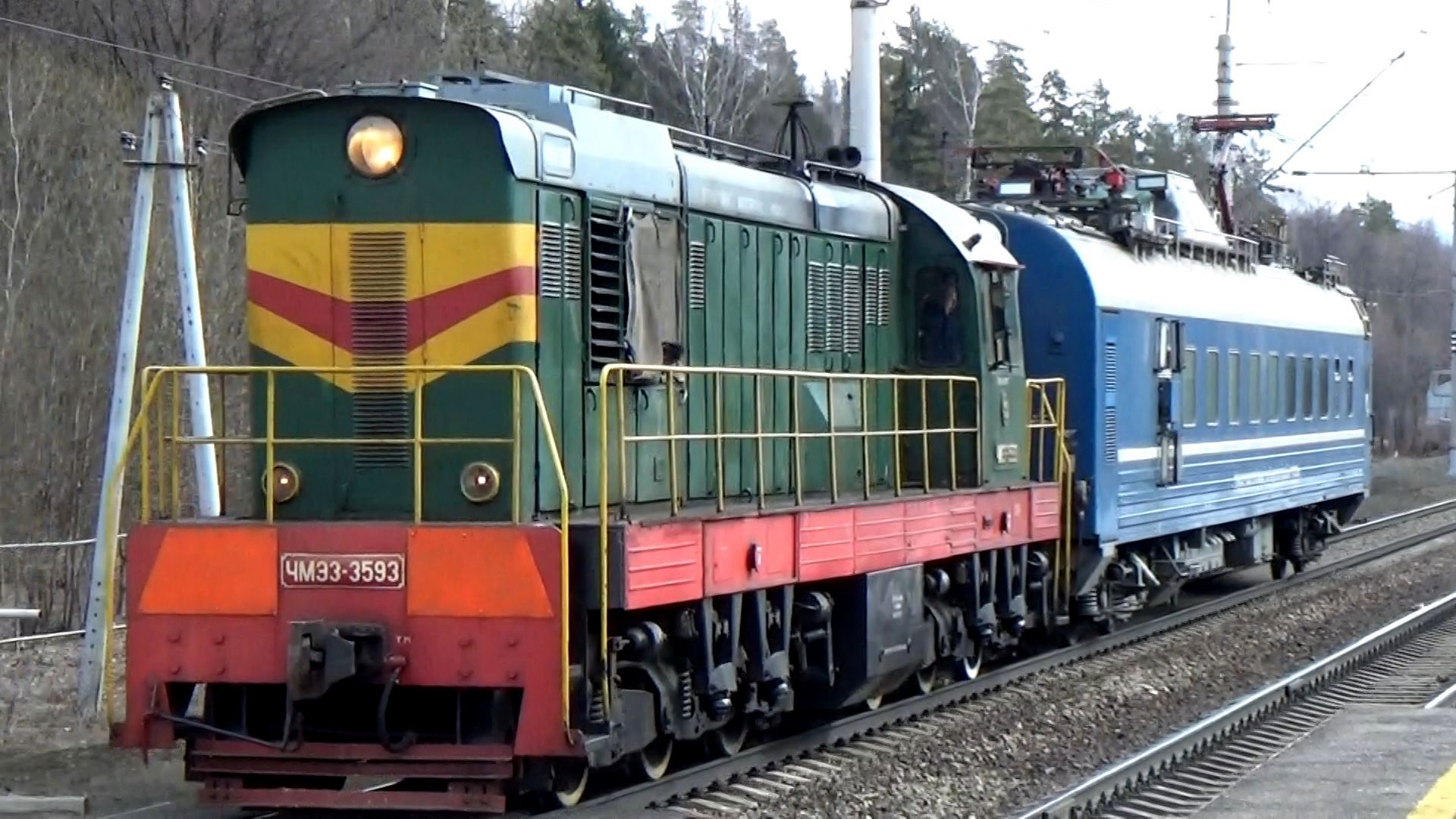 ЧМЭ3-3593 с вагоном "Лаборатория контактной сети". Станция Юрьевец