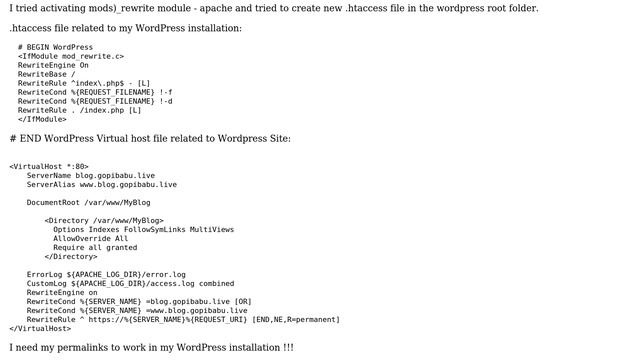 Wordpress: Permalinks are not working in Wordpress in digitalocean Helpful? Please support me on Patreon: https://www.patreon.com/roelvandepaar With thanks & praise to God, and with thanks to the many people who have made this project possible! | Content (except music & images) licensed under CC BY-SA https://meta.stackexchange.com/help/licensing | Music: https://www.bensound.com/licensing | Images: https://stocksnap.io/license & others | With thanks to user Gopibabus (wordpress.stackexchange.com/users/174203), and the Stack Exchange Network (wordpress.stackexchange.com/questions/346137). Trademarks are property of their respective owners. Disclaimer: All information is provided "AS IS" without warranty of any kind. You are responsible for your own actions. Please contact me if anything is amiss at Roel D.OT VandePaar A.T gmail.com