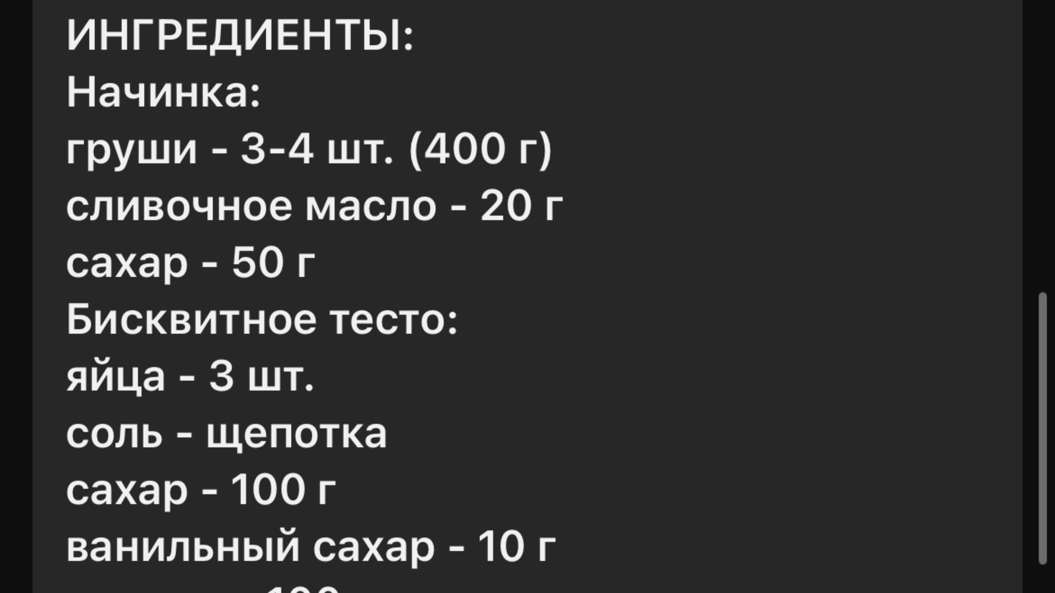 *** * ******************** ИНГРЕДИЕНТЫ: Начинка: груши - 3-4 шт. (400 г) сливочное масло - 20 г сахар - 50 г Бисквитное тесто: яйца - 3 шт. соль - щепотка сахар - 100 г ванильный сахар - 10 г молоко - 100 мл растительное масло - 100 мл разрыхлитель - 12 г мука - 200 г
