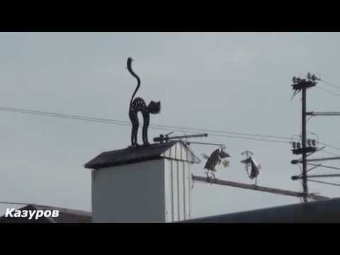 Кот и вороны на крыше