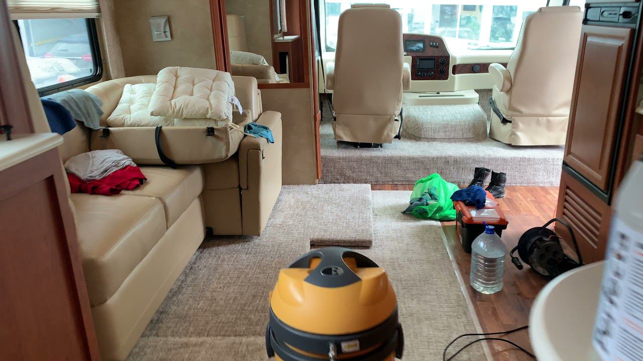 Дом на колёсах Заменили напольное покрытие на качественный ковролин✅ Сделали масштабную химчистку всего дома✅ В планах заменить и перетянуть передние сидения. Вместо устаревших и заметно потрепавшихся заводских будем ставить более комфортные и современные кресла‼️